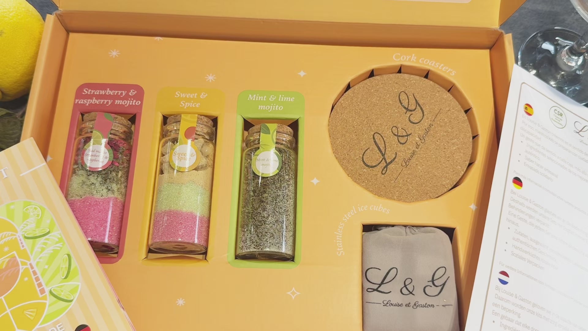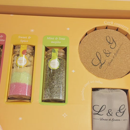 - 🧊 Accessoires Premium Inclus: Ce coffret ne s’arrête pas aux saveurs : 4 glaçons en acier réutilisables maintiennent vos cocktails bien frais sans dilution, tandis que les 2 dessous de verre en liège ajoutent une touche naturelle à vos apéritifs.